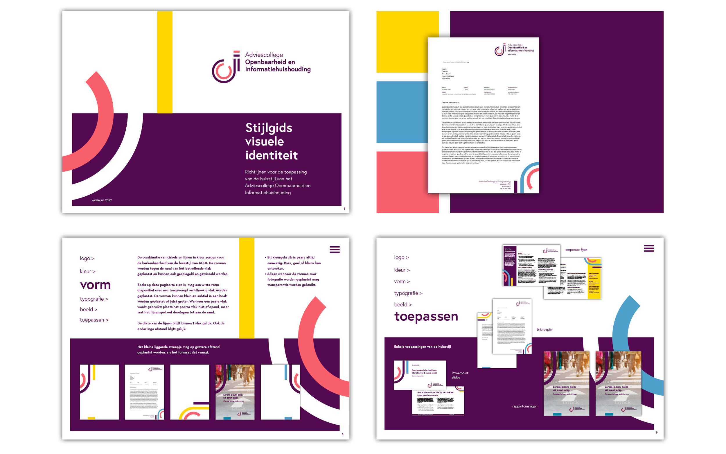 Het Adviescollege Openbaarheid en Informatiehuishouding houdt zich bezig met de Wet open overheid, de Woo. Het gaat daarbij over de manier waarop de overheid haar informatie openbaar maakt. Het Adviescollege onderzoekt de stand van zaken en brengt adviezen uit aan de regering en het parlement. Om visuele herkenbaarheid van het ACOI te creëren is een logo en een bijbehorende huisstijl ontwikkeld. Het uitgangspunt voor de huisstijl zijn de 4 waarden van het Adviescollege: openbaar, onafhankelijk, transparant en kritisch. Deze worden bij alle uitingen in het achterhoofd meegenomen. Ik maakte deze huisstijl voor ACOI tijdens mijn dienstverband bij Optima Forma.