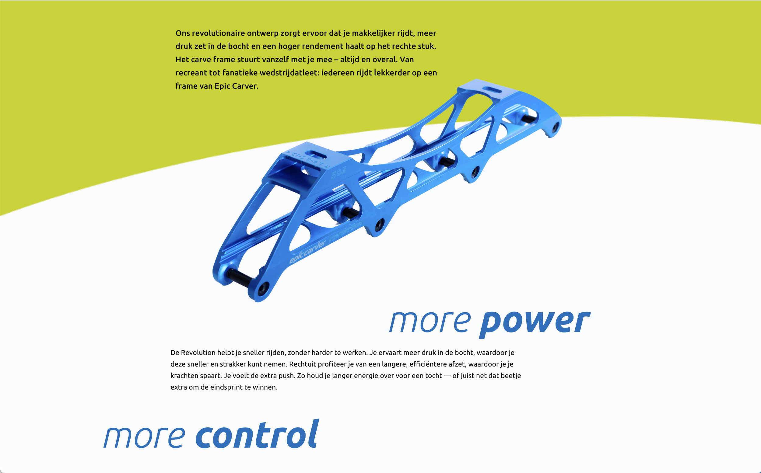 Epic Carver is een innovatief sportmerk wat een nieuwe vinding op de markt brengt: het carve frame voor inline skaters. Een échte nieuwe vinding die de wereld van inlines katers gaat veranderen, zoals de klapschaats dat heeft gedaan voor schaatsers. Je kan met dit frame veel lekkerder door de bochten! Die dynamische curve komt tot uitdrukking in de typografie van het logo en de vormtaal die hoort bij de huisstijl. Ik maak alles voor het merk, van website tot en met de montagehulp voor het onderschroeven van je innovatieve frames.